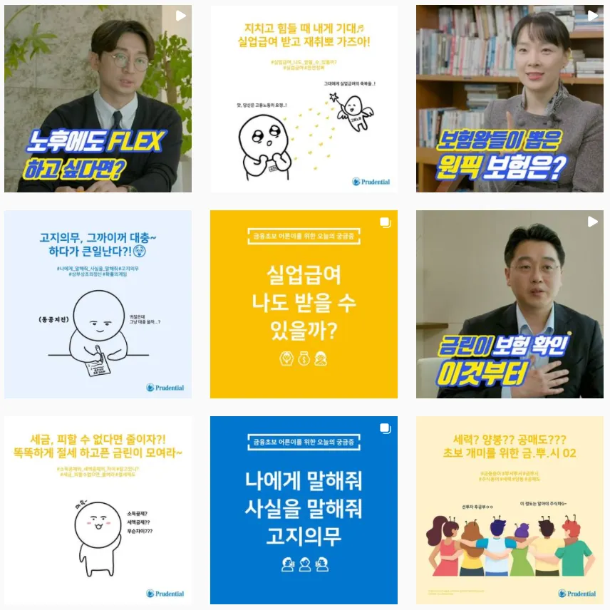 총 6개의 영상으로 구성되어 있으며, 푸르덴셜생명 소속 보험설계사인 라이프플래너 8분을 모시고 인터뷰 형식으로 진행했습니다. 이들은 단순 보험설계사가 아니라, 다양한 금융 분야에 능통한 재무설계사로서 금린이들이 보험에 관해 궁금해 할 만한 요소들에 대해 답변해줍니다.
