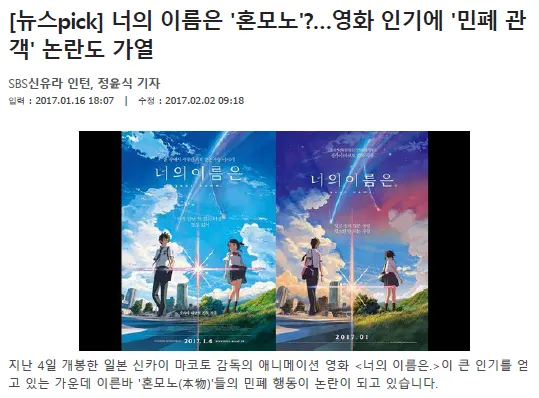 작성했던 기사 중 포털에서 가장 인기가 많았던 '너의 이름은' 관련 기사, 일 종합 유입 약 30만 회